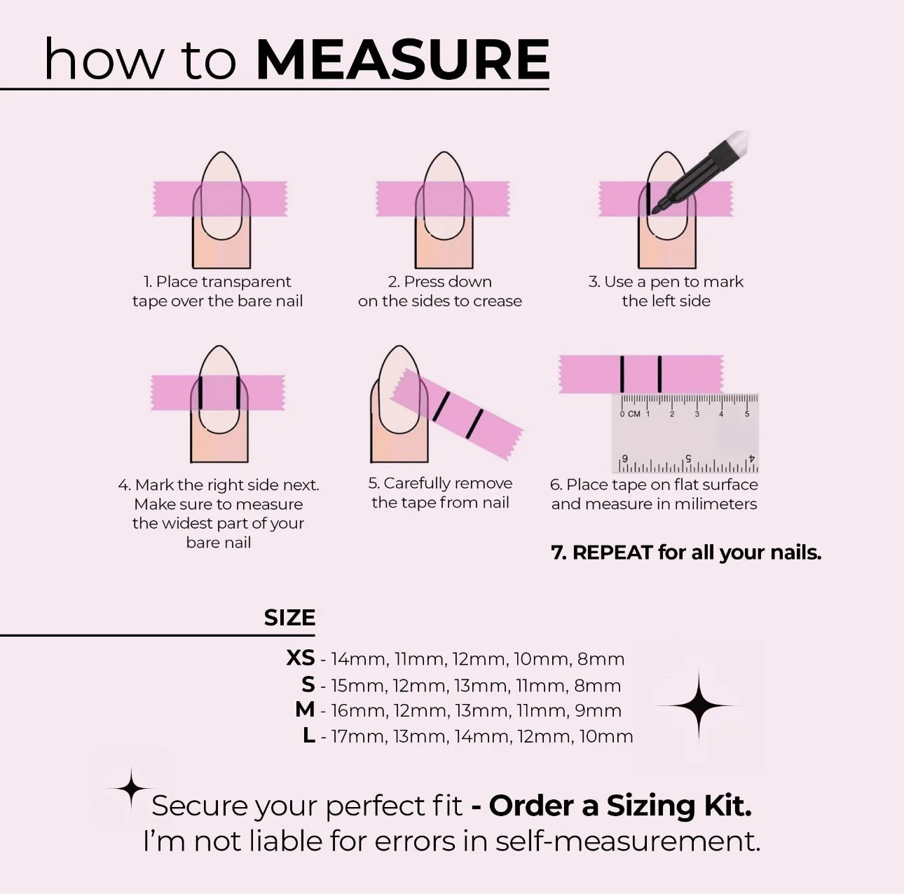 A step-by-step guide on how to measure fingernail size, including placing transparent tape over the nail, pressing down on the sides, marking the left and right sides, removing the tape, and measuring in millimeters with a ruler. Instructions emphasize repeating for all nails and suggest ordering a sizing kit.