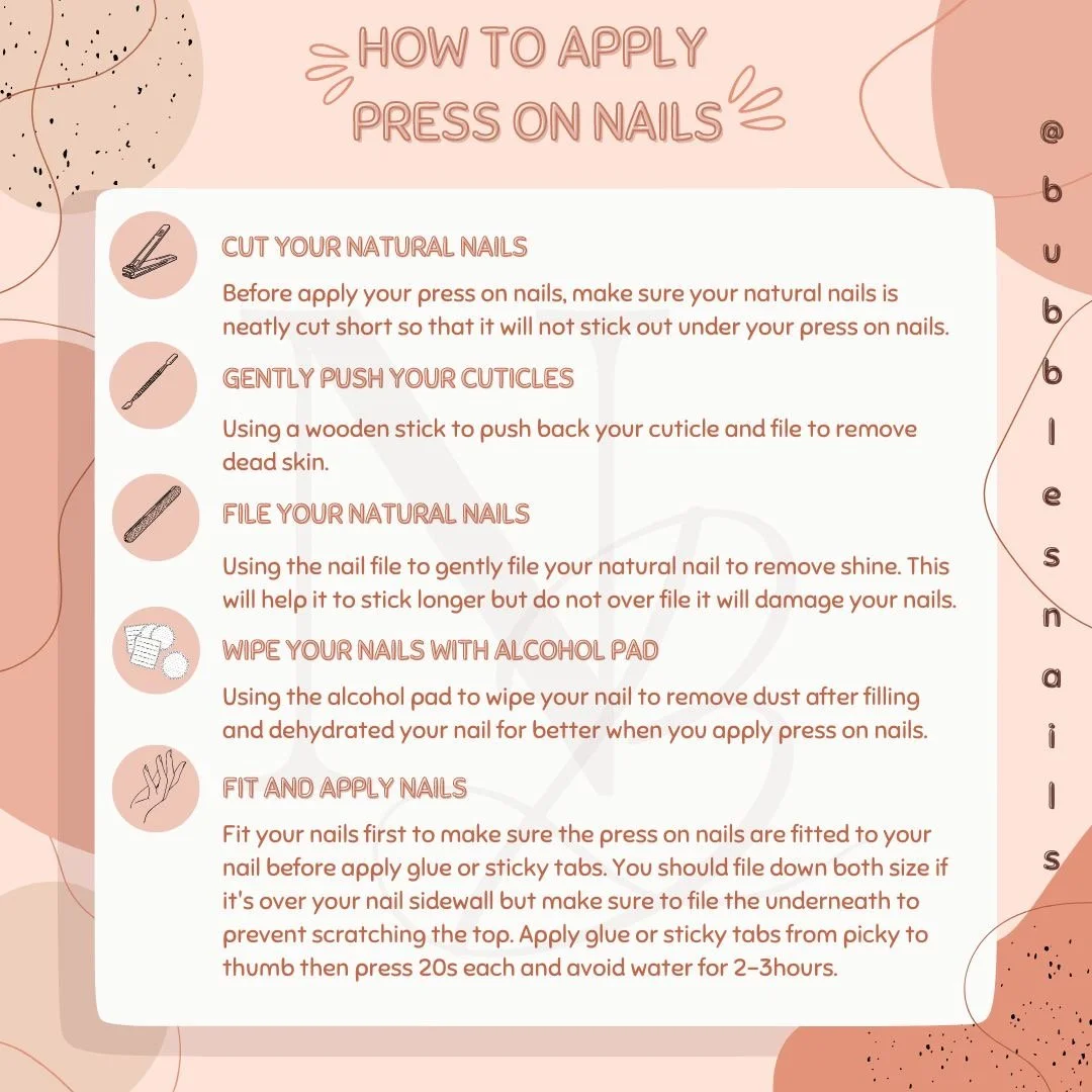 A step-by-step guide on how to apply press-on nails with text and icons on a pink and beige background.
